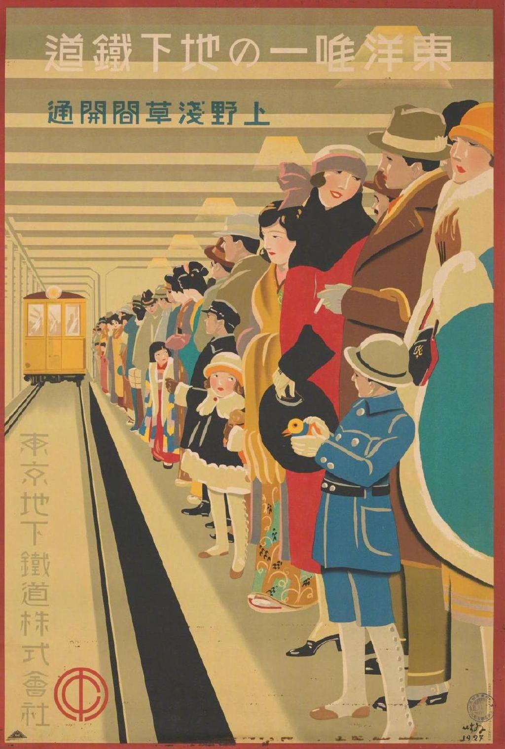这是日本艺术家杉浦非水为1927年新建的东京地铁而创作的海报《1927年东洋第一条地下铁道》。该海报并未使用日本传统的浮世绘画法和西方的古典油画画法,而是将图像几何化、抽象化。这种新的表现形式广为日本艺术家采用。