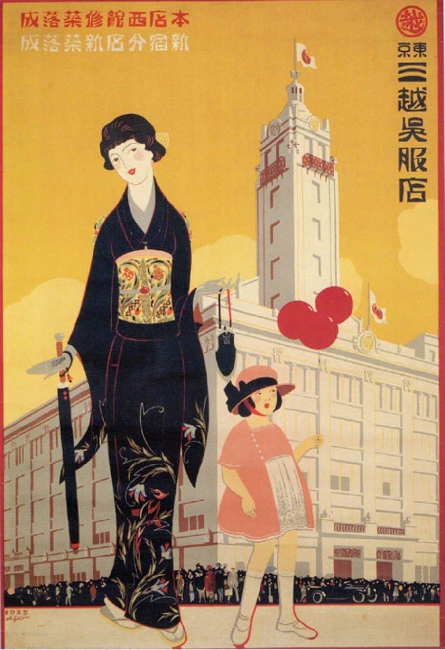 这是杉浦非水为东京三越吴服店创作的广告海报。可以看出,在描绘日本传统文化元素“吴服”时,日本艺术家也是使用新潮的极简画法而不是传统画法,而对人物的描绘也再不是像传统浮世绘一样的呆板臃肿,而是细长身材、大眼美女的形象。没有大正时代艺术界对人物表达的革命性转变,昭和时期的日本漫画繁荣不会出现。